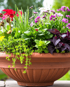 For apartment dwellers and those lacking outdoor space, garden merchandisers say, “no problem”, and back that up with an amazing area of houseplants (which can be moved outside, space and climate permitting). The world of fancy-leaf begonias has expanded with new entries including ‘Joy’s Jubilee’, an exuberant swirl of ruffled green and maroon leaves, dappled in white. Foliage plants—restful and otherwise—are also very popular, especially in large sizes, with new introductions like the elephant-eared Alocasia ‘Variegated Freydek’, flaunting its huge green and white leaves, or white variegated monstera, with its artfully tattered foliage. Old-fashioned parlor maples (Abutilon) have shed their Victorian image and reappeared in new forms, like ‘Red Glory’, with scarlet hollyhock-like flowers, and the pink and white ‘Wedding Day’, which celebrates its name with nodding blooms.